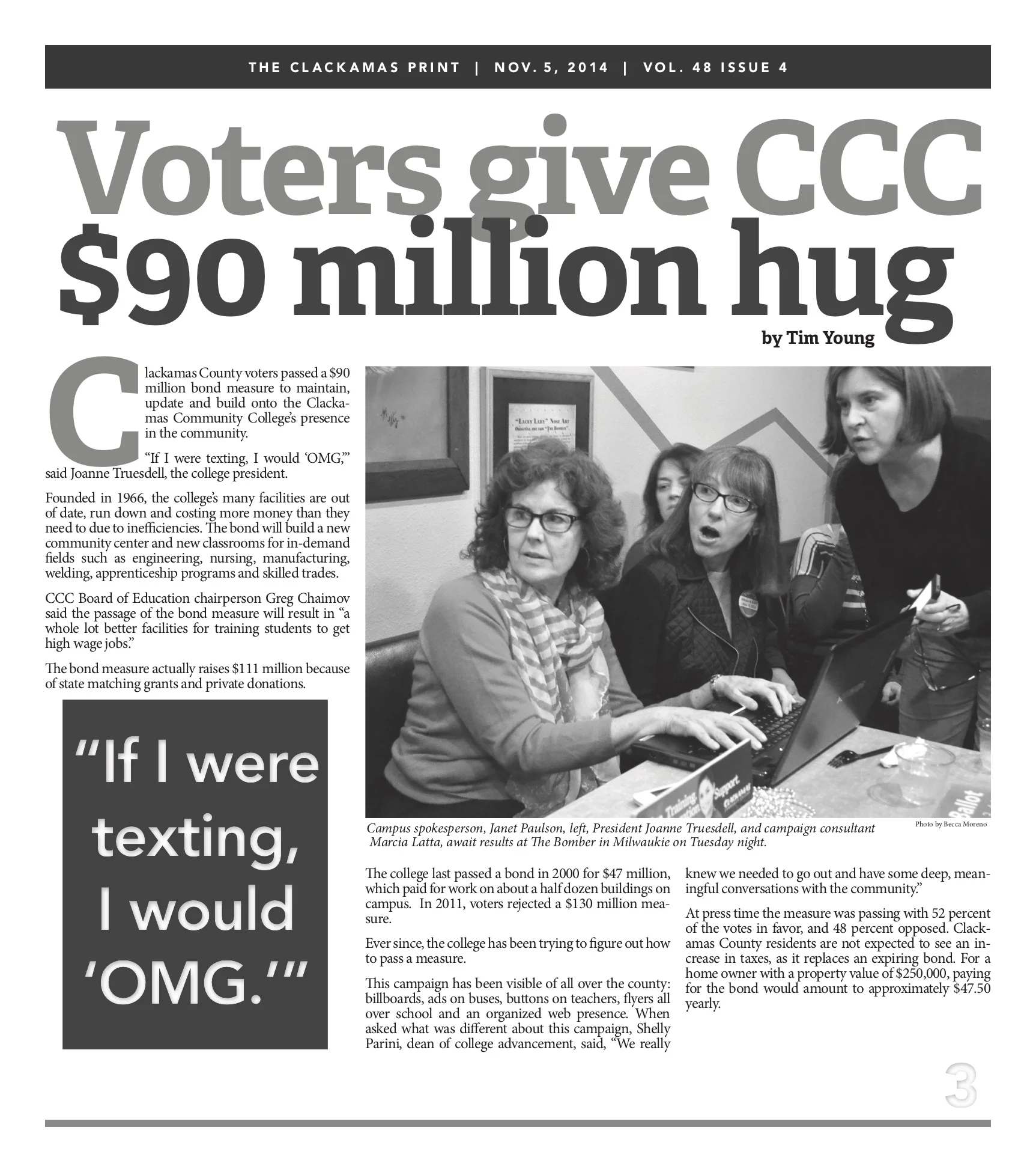 I captured this photo during the Nov. 2014 elections. it earned me two awards at the Oregon Newspaper Publishers Association’s Collegiate Day later that year including First Place for “Best Spot News Photo” and Third Place for “Best Photography.” Pictured (center) is the President of the college as she looked over at a TV displaying updated results of the election. It was a very proud moment for me and I was humbled and honored to have been a spectator for this monumental decision for the college.